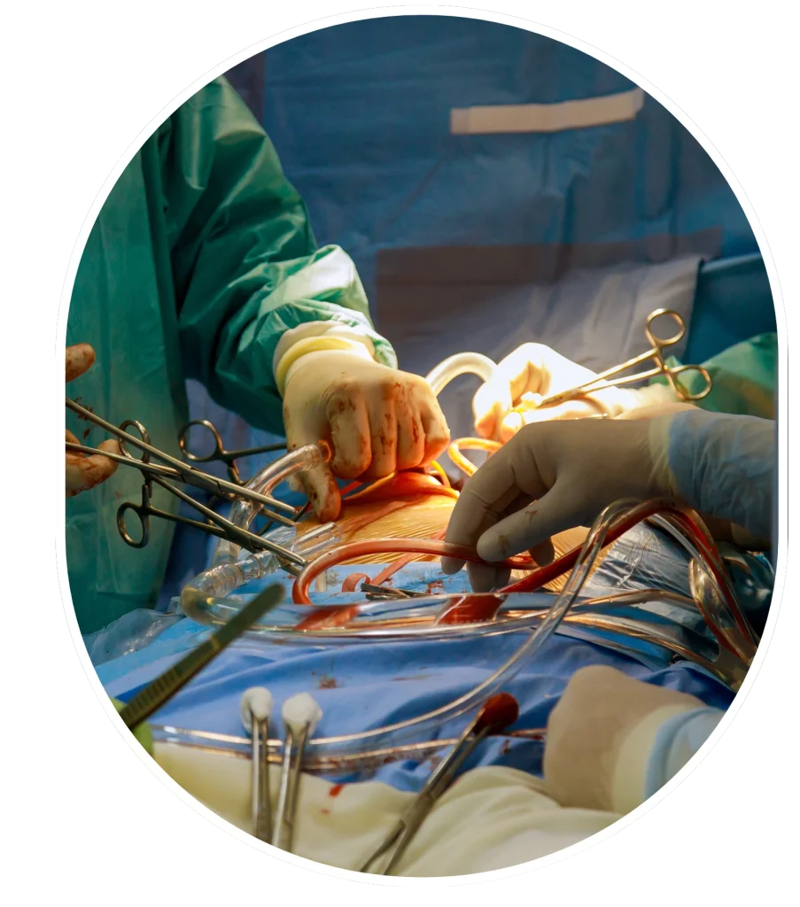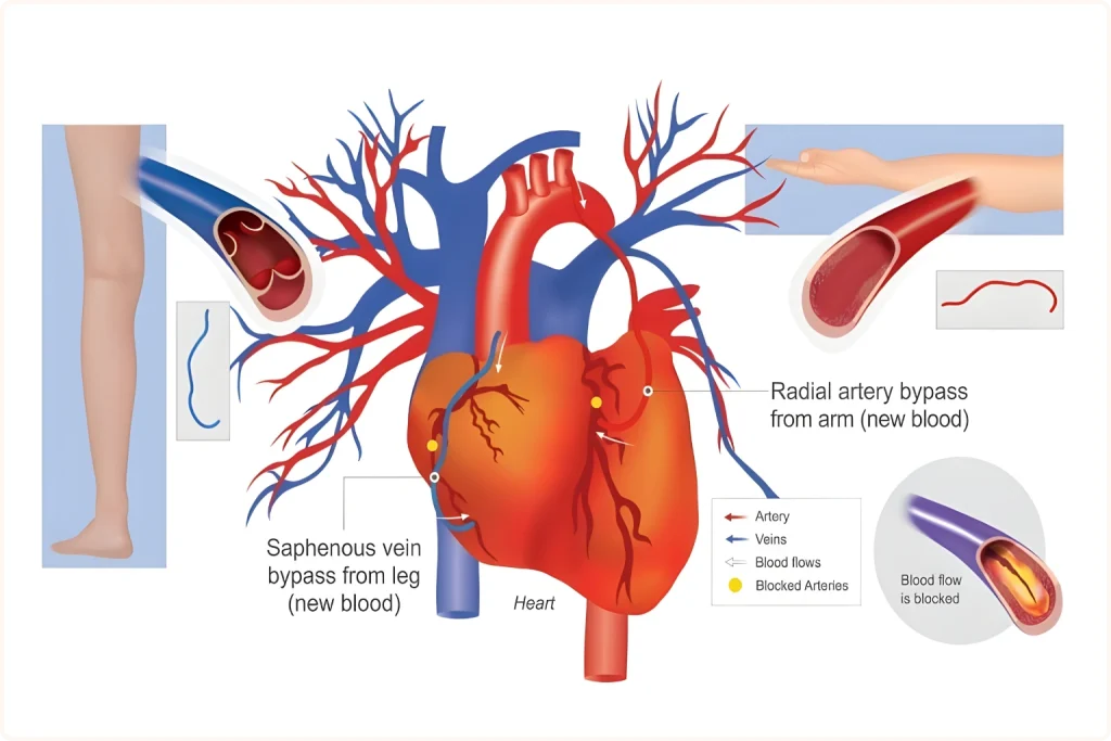 Heart Bypass Surgery involves creating a new pathway for blood to flow around blocked or narrowed coronary arteries. This is done by grafting a healthy blood vessel from another part of the body — usually the chest, arm, or leg — to bypass the blockage and improve oxygen supply to the heart.