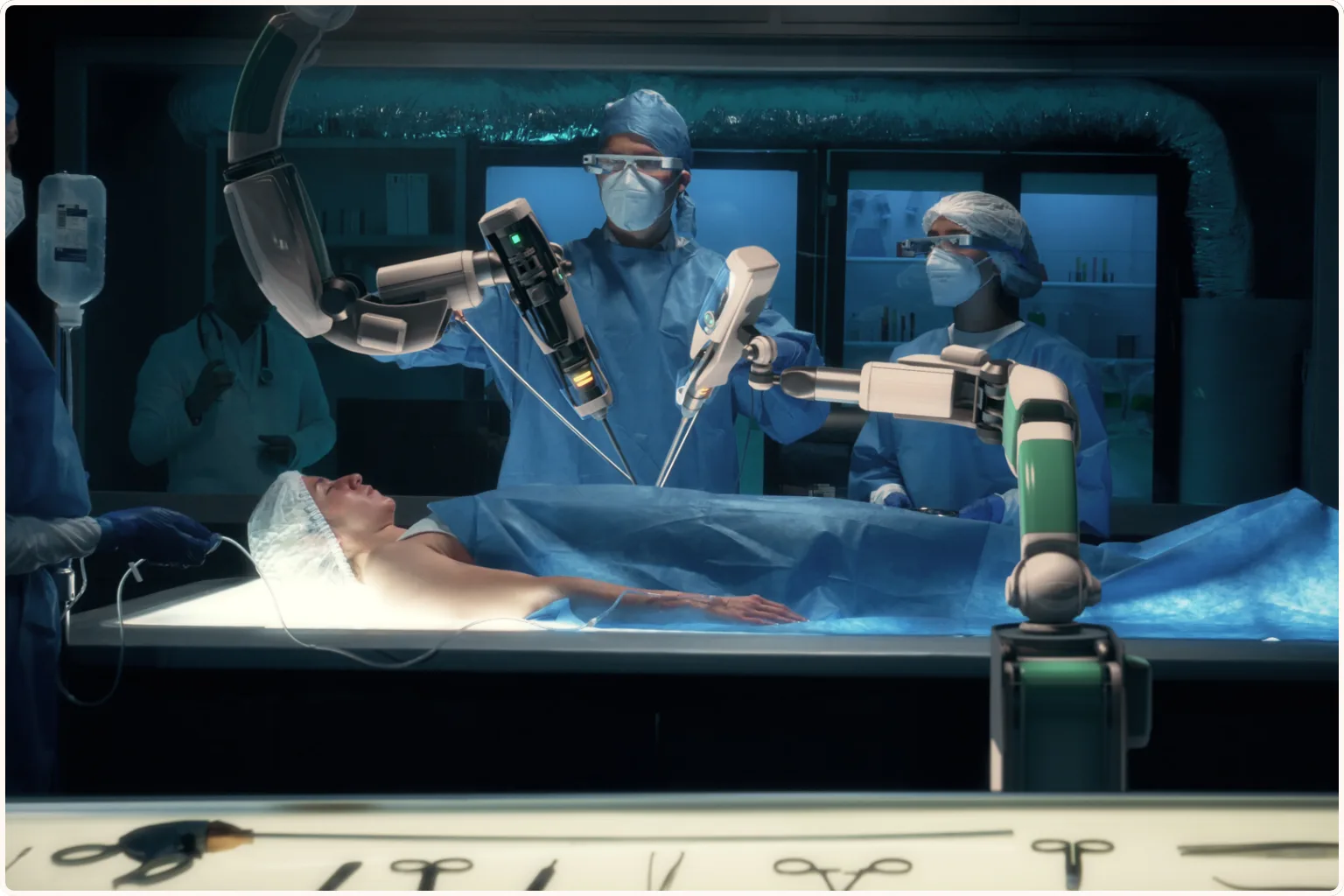 - Dr. Bhushan sits at a control console, guiding robotic arms that hold miniature surgical instruments.